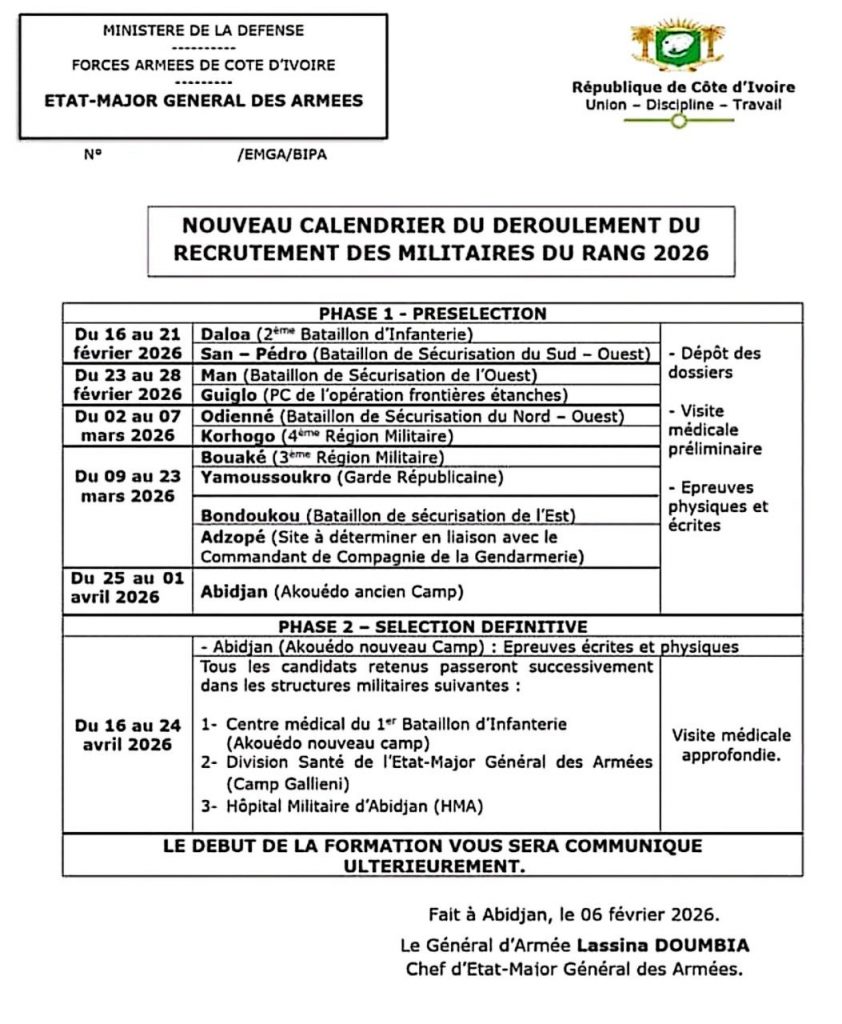 • Du 16 au 24 avril 2026 : Abidjan (Akouédô — nouveau camp) — épreuves écrites et physiques